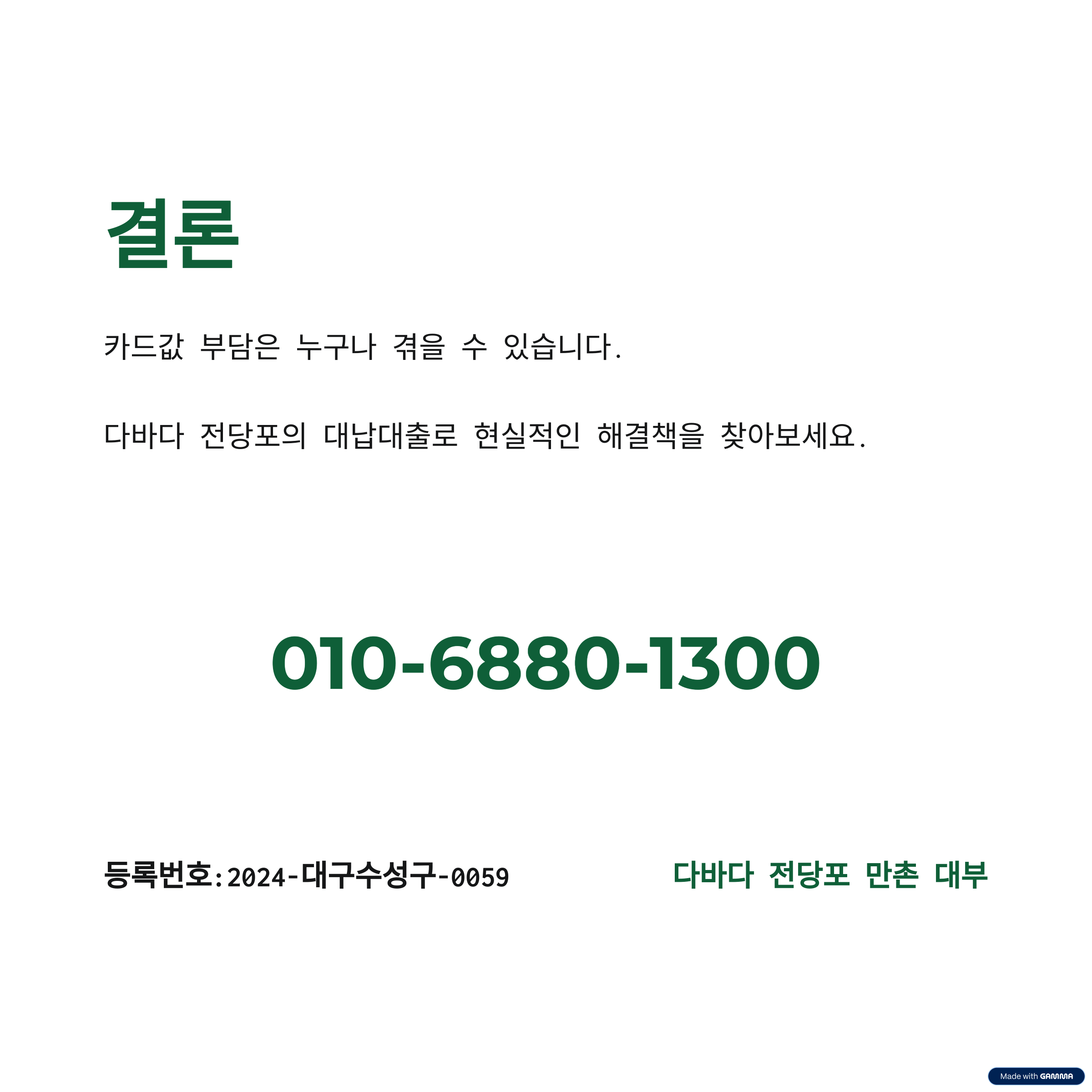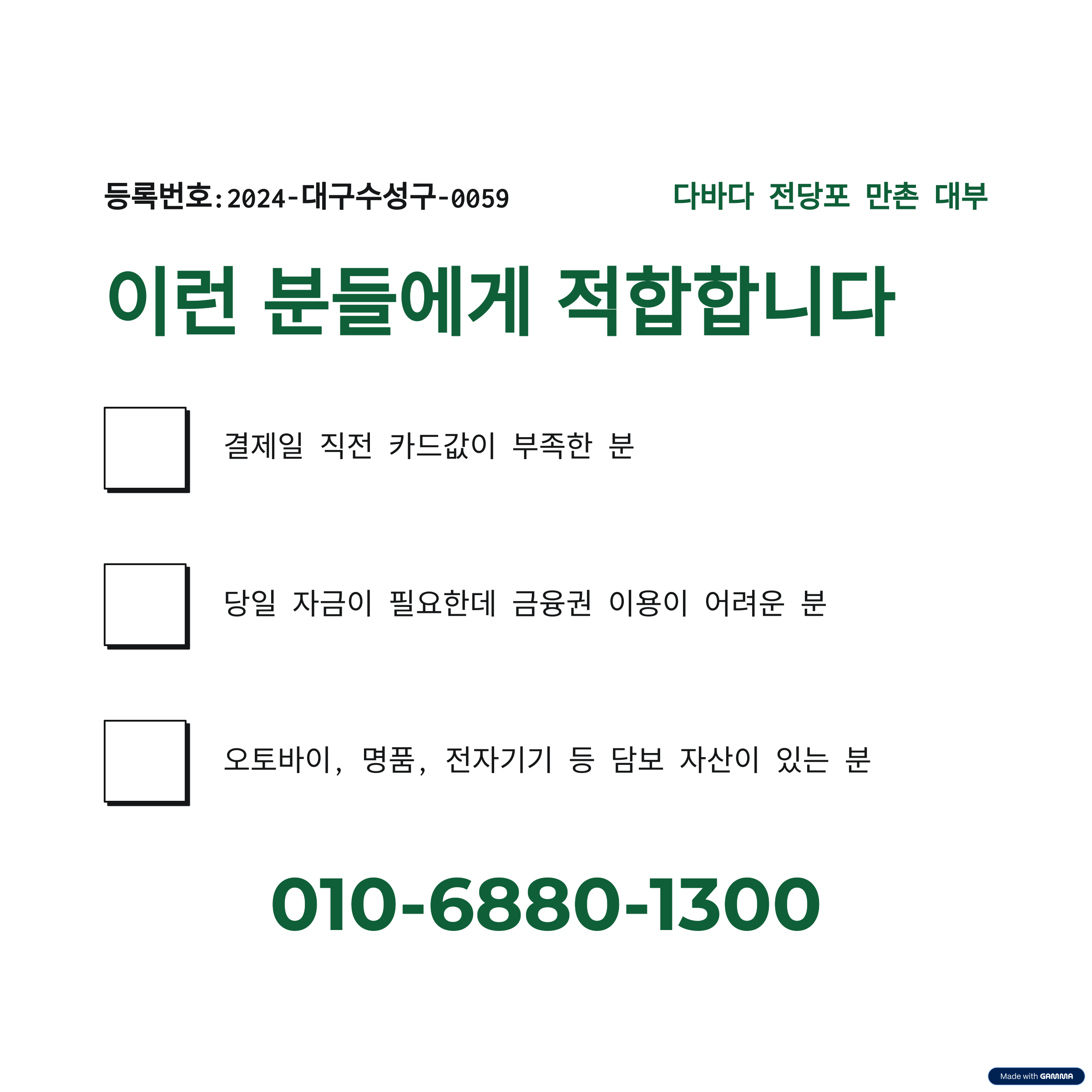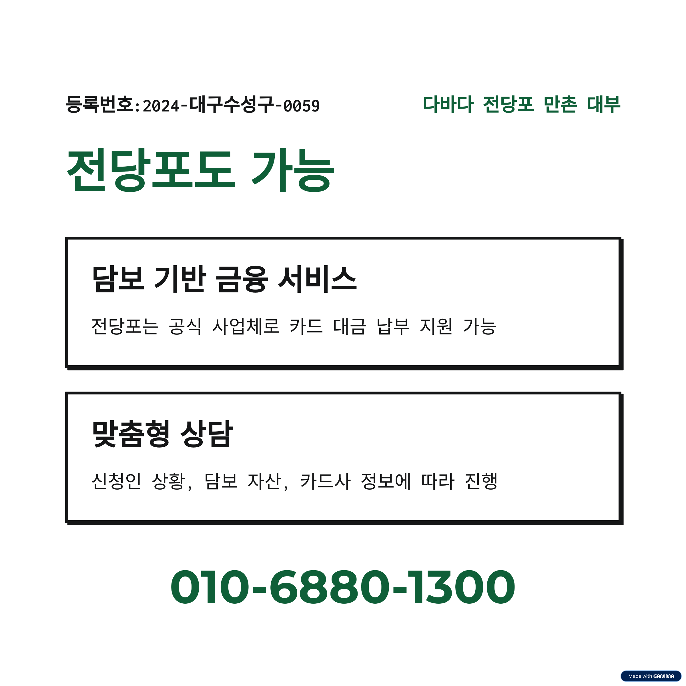 대구 수성구에 위치한 다바다 전당포 만촌점에서는 카드 대납대출에 대한 맞춤형 안내와 상담이 가능합니다.