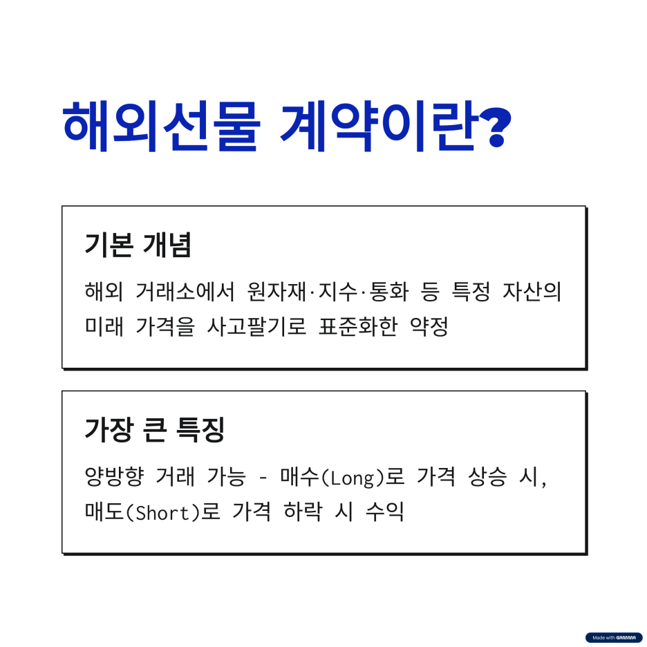 해외 거래소에서 원자재·지수·통화 등 특정 자산의 미래 가격을 사고팔기로 표준화해 둔 약정이다.