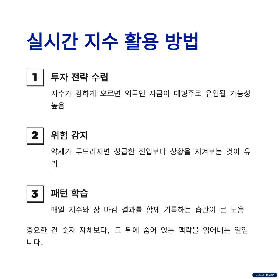 실시간 지수는 국내 장 투자 전략을 세우는 데에도, 위험을 미리 감지하는 단서로도 쓸 수 있다.