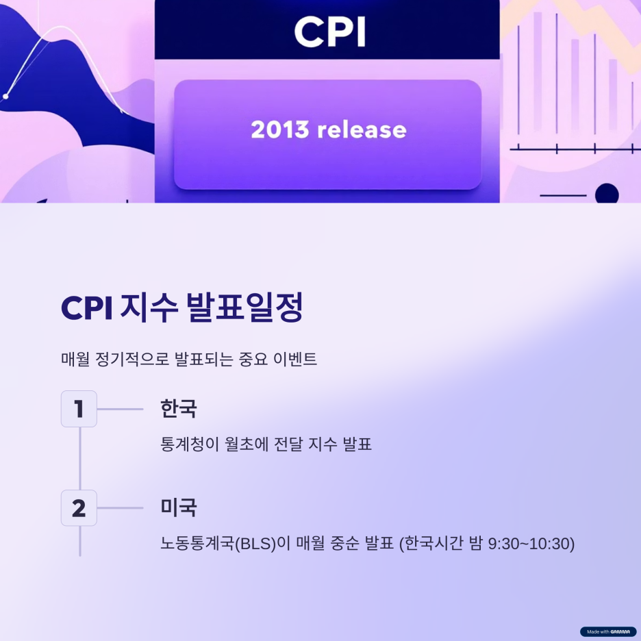 미국은 노동통계국(BLS)이 매월 중순에 발표하며, 발표 시각은 현지 기준 오전 8시 30분이다.