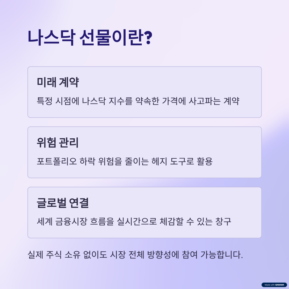 이런 특성 때문에 나스닥 선물은 단순한 투기 수단을 넘어 세계 금융시장의 흐름을 읽는 창구 역할을 한다.