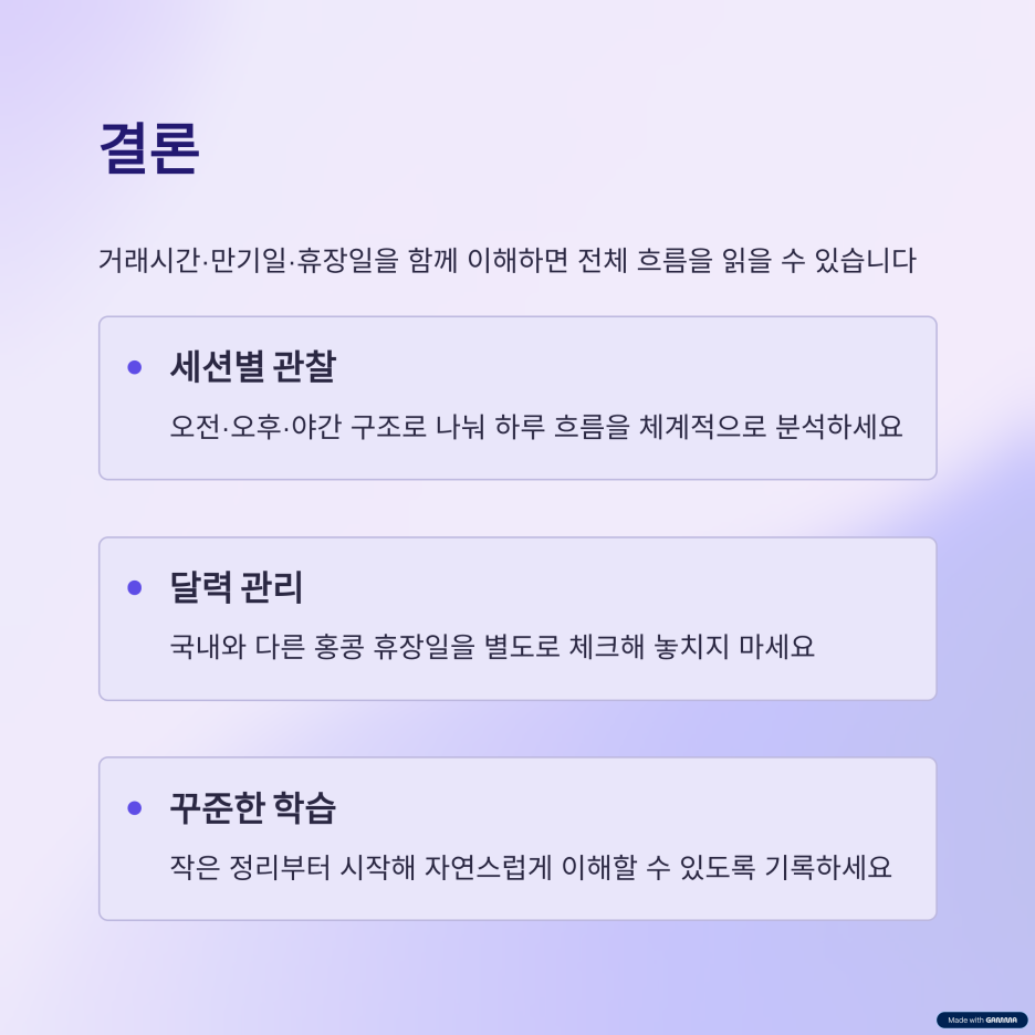나 역시 처음에는 홍콩 지수를 단순히 참고 지표 정도로만 생각했지만, 실제로 학습하다 보니 거래시간, 만기일, 휴장일 같은 기본 구조를 정확히 알아야 한다는 걸 깨달았다.
