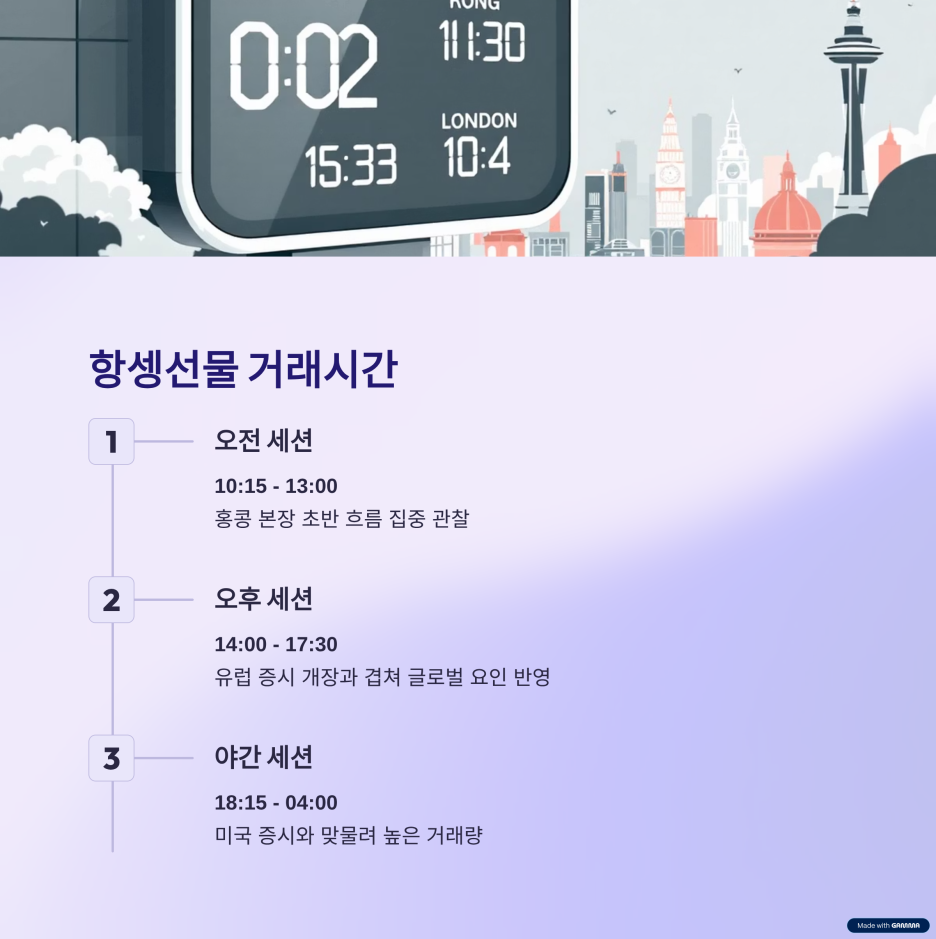항셍선물은 아시아 시장을 대표하는 지수 선물로, 거래시간·만기일·휴장일을 함께 이해해야 전체 흐름을 읽을 수 있다.