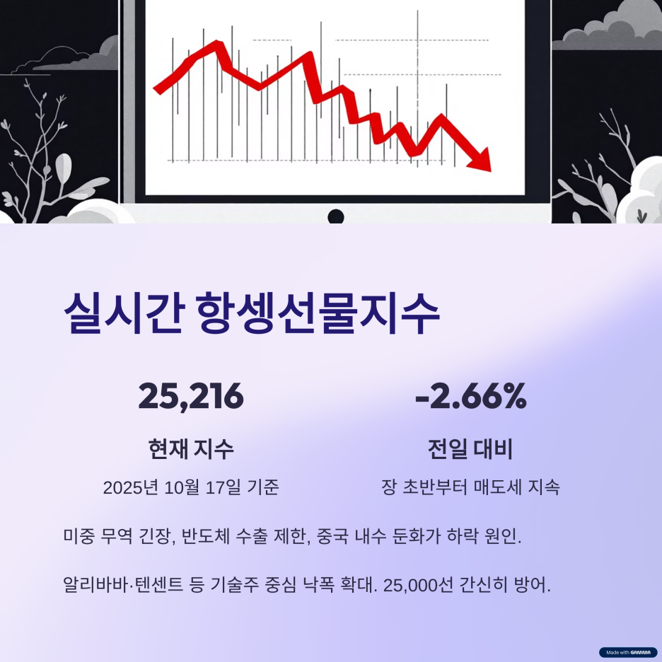 오늘(2025년 10월 17일) 항셍선물지수는 25,216.00으로 전일 대비 2.66% 하락했다.