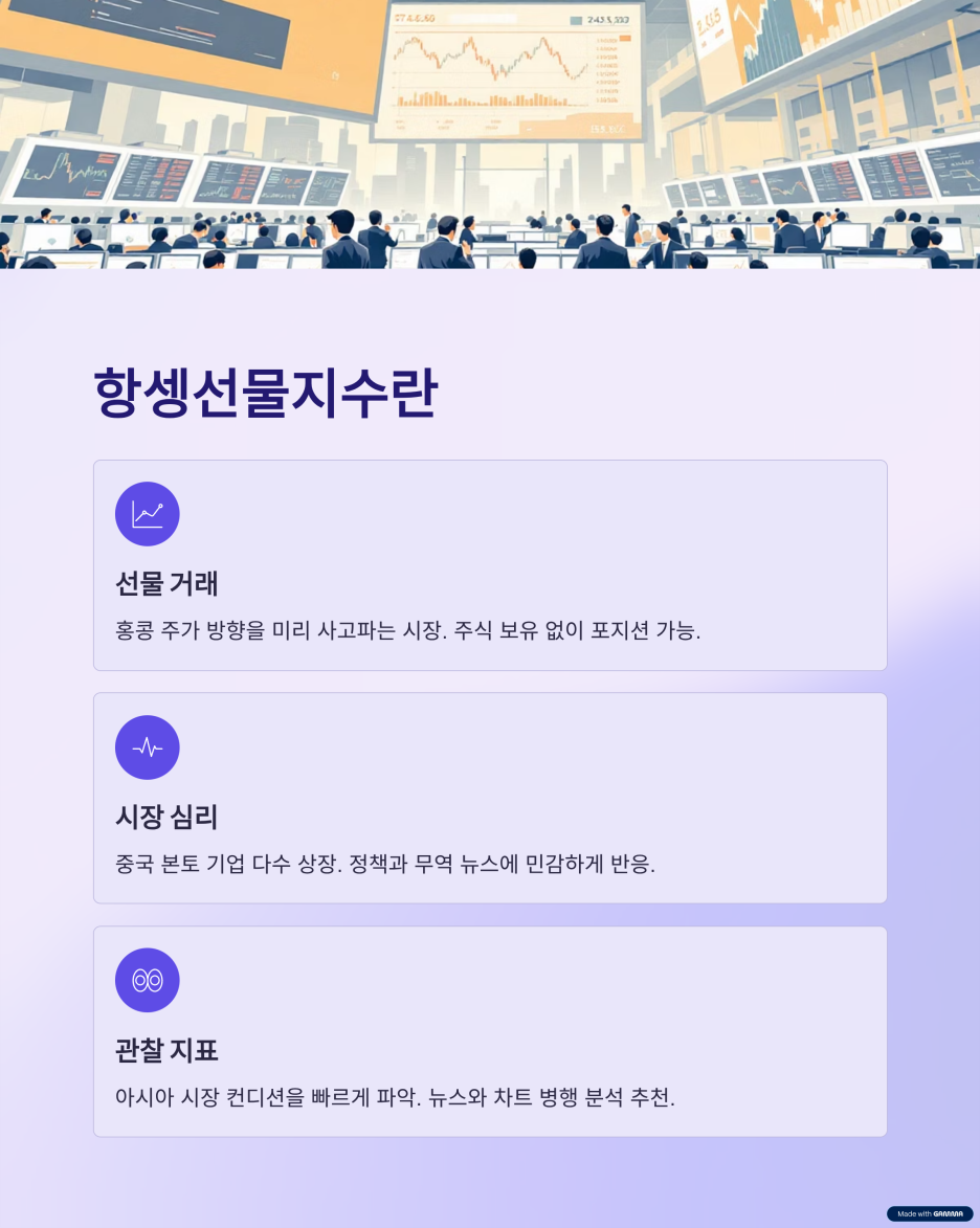 특히 홍콩 항셍선물지수는 시장의 긴장을 그대로 드러내는 지표라서, 흐름을 따라가다 보면 지금 자금이 어디로 움직이는지 감이 온다.