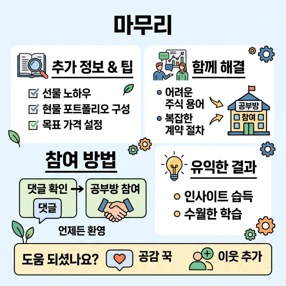 추가적인 선물 노하우나 현물 포트폴리오 구성 팁, 그리고 목표 가격 설정법 등이 궁금하시다면 공부방에 언제든 참여해 보세요.